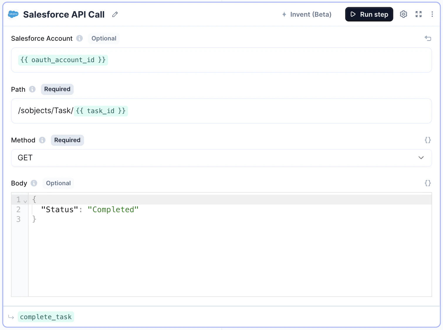 Once your account is connected, you can use the Salesforce API call step in the Tool builder. This tool step allows you to complete Salesforce-specific activities, like managing Leads, Contacts, Notes, Tasks and more.Use Salesforce API tool-step